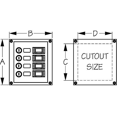 Vertical 4-Gang Rocker Switch Panel is constructed of fire resistant injection molded nylon. These panels are suitable for use in engine room compartments. Features four 15A 12VDC illuminated SPST On/Off rocker switches and four fuse holders for use with standard AGC 1/4" x 1-1/4" glass style fuses. Individual circuit 10A max. 37A total. 12VDC. Includes a sheet of 20 preprinted decals to customize to your specific applications. Installs with four #6 RH fasteners (not included). Meets CE specifications.