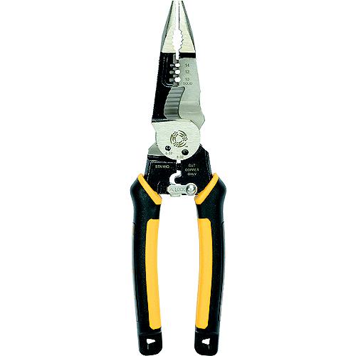 The 7-In-1 multi-tool pliers are perfect for stripping, shearing, gripping, crimping, reaming, and spanning and shearing bolts. The scalloped blade cuts easily and efficiently. These multi-tool pliers come with tether ready handles for drop prevention. Heavy duty forged steel stands up against rugged work environments. Strips 10-14 AWG SOL & 12-16 AWG STR. Shears 6-32 & 8-32 Bolts.