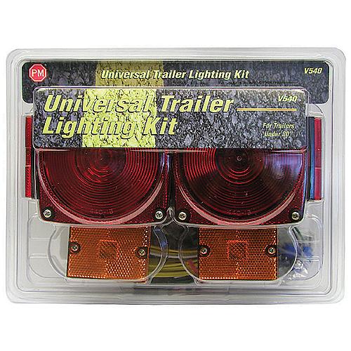 Kit provides all legal lighting and reflectors for trailers under 80" wide. Includes one each of the 440/400L tail lights, two 114A side marker lights, 20' trailer harness, 48" trunk connector, license bracket, mounting hardware, and installation instructions.