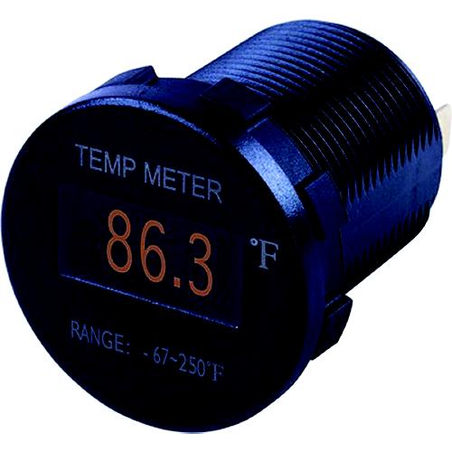 OLED (Organic LED) Temperature Meter is designed to withstand constant vibration and the rigors of a wet marine or dusty outback environment. Monitors temperature on a bright, waterproof, daylight readable OLED screen. High contrast and resolution make this screen visible from a wide viewing angle, even with polarized sunglasses. Reverse polarity protected. Same compact round size as a standard 12V receptacle, this OLED Temperature Meter provides many installation options. Injection molded nylon construction. Includes a prewired temperature sensor with a 6' cable. IP66 rating.