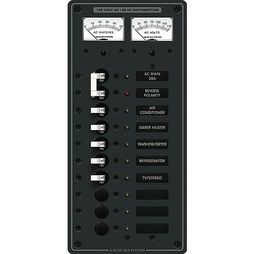 Ten total circuit breaker positions, 3 blank. Red reverse polarity indicating LED. 0-50 ampere ammeter with remote sensing coil. All hot, neutral and safety ground buses installed, fully pre-wired. Includes set of 30 common AC labels. Five 15 amp circuit breakers installed. One double-pole 30 amp AC main circuit breaker installed. 0-150 volt AC voltmeter. Dimensions: 11.25" H x 5.25" W