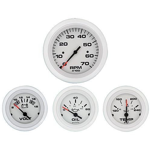 Stylish White bezel design, black on white graphics, accurate and reliable, these tough instruments look good on all types of boats. Domed glass sheds water and resists scratching. Instruments available for most outboards, stern drives and gasoline-powered inboards.Features: Enhanced illumination: through-dial and perimeter lighting for excellent readability at nightU.S. and metric scales, with ISO symbols, where appropriateOptional add-on eyebrow or square bezels availableIncludes Tach, Voltmeter, Oil Pressure & Water Temp