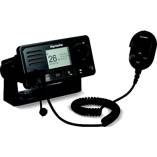 VHF radio features an internal AIS receiver and loudhailer capabilities. Built on our marine radio chassis. Comes with oversized controls and a big screen for easy operation offshore. It also supports optional wired or wireless RayMic controllers for true multi-station control and intercom capability. When connected to an optional hailing horn, it can generate automatic fog signals and work as a public address announcement system. Marine VHF with Digital Selective CallingInternal AIS receiver provides target data for chartplotter, radar, and instrumentsFog signalling and public address functions with optional hailing hornWired or wireless expansion with optional RayMic handset stationsInternal GPS/GNSS receiver with a connection point for an optional external antennaNMEA2000 and NMEA0183 networking for integration with onboard systemsAudio output connection for optional passive remote speakerSurface and trunnion mount kits includedStyled to compliment the Axiom family of chartplotter displays