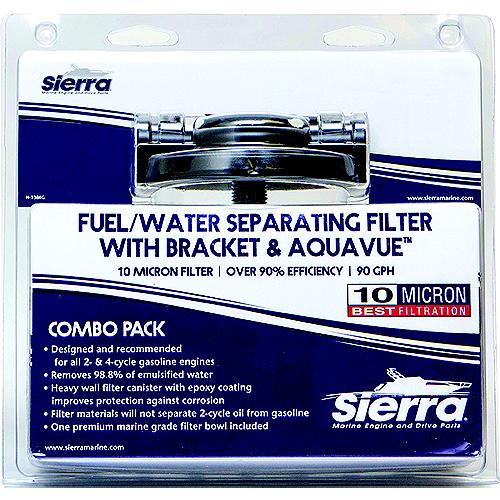 Sierra fuel water separators remove over 98.8% of emulsified water from your gasoline. Sierra's 10 micron filters are over 90% efficient at removing particles as small as 10 micron. All filters flow @ 90 GPH to feed even the hungriest motor. Recommended to prevent damage to sensitive inboard and outboard fuel injection systems.Includes: Bracket, Filter and 2 brass pipe plugs (3/8" plug - 18-4264, 1/4" plug - 18-4256)