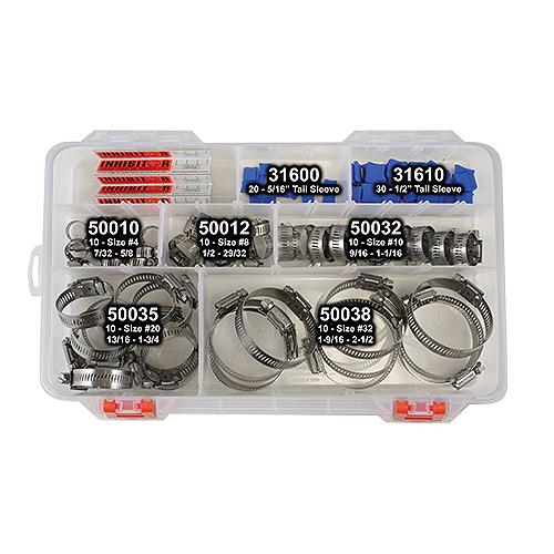 Contains 50 assorted Breeze 316 stainless steel clamps and 50 protective clamp tail sleeves. Includes 1 box (10ea) of sizes 4, 8, 10, 20 & 32.