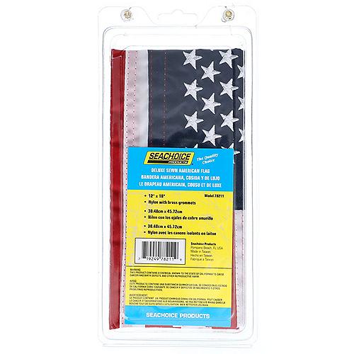 This 12 inch x 18 inch deluxe sewn United States flag is made with 100 percent nylon to ensure maximum resistance to fading. Reinforced headings, brass grommets and double stitching further enhance the lasting durability of this beautiful flag with vivid white stars.Seachoice is committed to delivering quality marine accessories and OEM replacement parts to satisfy fishing, boating and watersports enthusiasts worldwide. Seachoice is run for and by boaters offering a wide-ranging product line while remaining affordable. 100% NylonReinforced headingsDouble stitching for extra durabilityBrass grommets