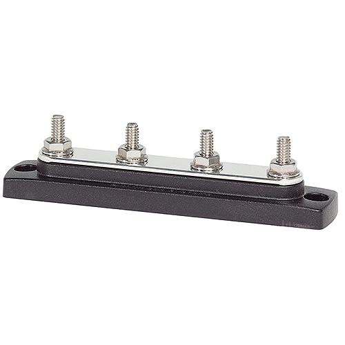 Industry standard BusBar features tin-plated copper bus, 1/4" stainless steel studs and 8-32 terminal screws. Continuous rating 150 Amps AC/DC, maximum voltage 300 Volts AC, 48 Volts DC.