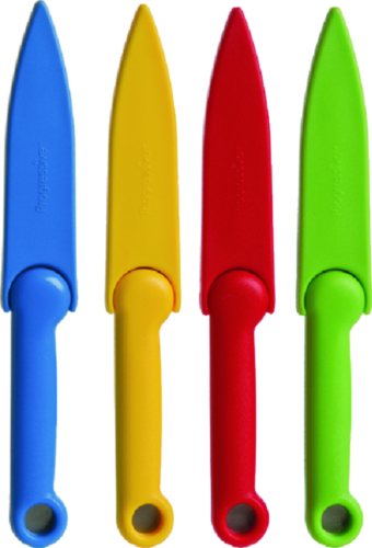 Set of 4 knives. Color coded to reduce cross contamination - Red for meats, blue for seafoods, yellow for poultry and green for vegetables. Protective snap-on covers for safe storageDishwasher safeMaterials: ABS, Polypropylene and Stainless Steel