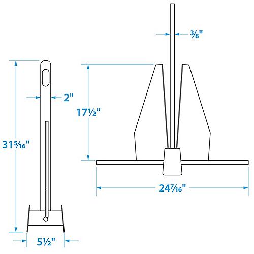 Dollar for dollar your best buy in anchors. Superior holding power in a traditional designed anchor. Each anchor is hot dipped galvanized for maximum corrosion protection. Individually inspected to assure quality and workmanship. Reinforced wide flukes penetrate deeply and firmly for maximum holding power. Specially engineered angles and welded crown configuration provide unsurpassed strength and durability. "Boat Size", "Line" and "Chain" are recommendations and are not included.