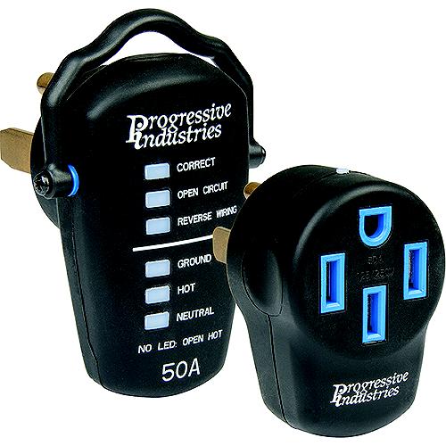Portable surge protector kits contain a separate receptacle tester to detect wiring faults at the pedestal and surge module to attach to the detachable power cord. Separating the two functions reduces the size of the product while increasing protection from inclement weather. Kit contains receptacle tester and surge module.