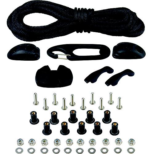 The Performance Anchor Trolley Kit features a zig cleat for easy, one-handed adjustability. The durable, one-piece cheek blocks operate silently. Easily unclip the custom designed ring and use the system as a leash. Kit includes: 30' of 3/16" polypro deck line (1), zig zag cleat (1), ring clip (1), cheek blocks (2), nylon pad eyes (6), 10-32 X 3/4" PH machine screws (10), 10-32 Nyloc nuts (10), #10 flat washers (10), and well nuts (10).