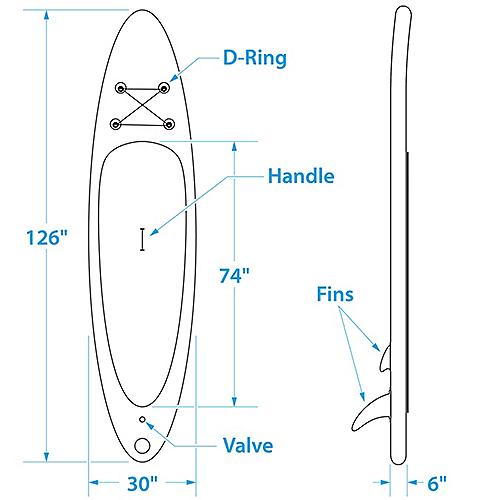 The Seachoice Inflatable Stand-Up Paddle Board (iSUP) has great stability, allowing it to handle different water conditions and positions. Portable & travel friendly. When deflated and rolled up it is easy to carry and store. The anti-slip deck is soft and stable. The iSUP maintains its shape when it is inflated to high pressure due to its 6" drop stitch construction and 0.7 mm extra supported fabric. The sidewalls use two PVC layers for superior air retention. Capacity: 1 Adult or Youth. Kit Includes (1) Inflatable Stand-Up Paddle Board(1) 3-Section aluminum adjustable paddle(1) Manual dual-action pump with pressure gauge(1) Back-pack style carry bag(1) Repair kit(2) Built-in fins, (1) removable fin(1) Coiled safety leash with ankle cuff(1) Coiled safety leash with ankle cuff