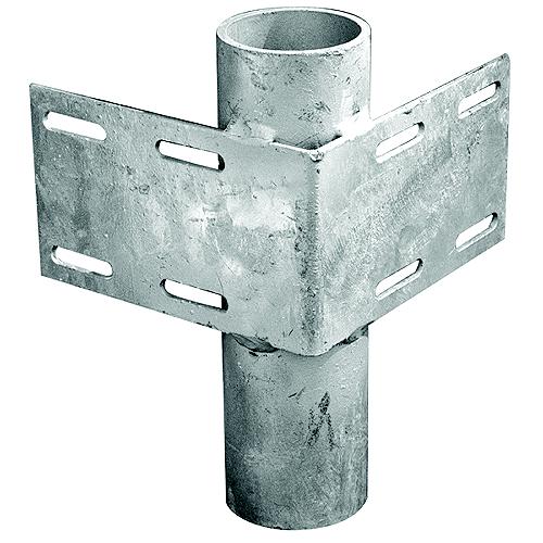 Commercial grade. Should be used with one of the outside corners and has an internal pipe holder. 8-1/4"L x 5"H. Requires carriage bolt set for attaching. 2" Pipe.