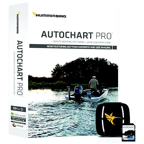 Humminbird® AutoChart PRO™ for North America (excluding Alaska) offers all the leading features of AutoChart-but with two key enhancements designed to give tournament anglers a competitive edge. Bottom Hardness Indication delivers a crucial tip-off to where fish are hiding by identifying areas likely to hold fish based on the hardness of the bottom. Side Imaging Mosaic allows you to overlay your Side Imaging returns onto your AutoChart map for a 3D visualization of fish-holding habitat. This feature gives anglers the ultimate understanding of the underwater world and what the structure looks like on their favorite fishing spots. With AutoChart PRO, you'll have all the tools you need to bring your next trophy into sight. *Both Bottom Hardness Indication and Side Imaging Mosaic are exclusive to AutoChart PRO.Map coverage where you make it. AutoChart PRO operates the same way as AutoChart by using proprietary software that takes your Humminbird's sonar returns and GPS to build custom lake charts. Create your own contour map on any lake in 3 simple steps: Record sonar data after inserting a blank SD card into your Humminbird Combo, Import your recordings into the AutoChart PRO PC program and convert your survey into a lake map and Export your map onto the Zero Lines Map Card (included) to display on any compatible* Humminbird.Now use i-Pilot Link on any lake when you create contours with Humminbird AutoChart PRO. Humminbird AutoChart PRO enables you to use Minn Kota® i-Pilot® Link™ on previously unmapped bodies of water after you create contours with the revolutionary AutoChart PRO PC Software. The i-Pilot Link's innovative Follow the Contour feature will direct the trolling motor to follow a specific depth contour. The chosen contour line can be automatically followed in either direction, or stay a set distance from that contour or shoreline with Contour Offset. For more information on the i-Pilot Link.