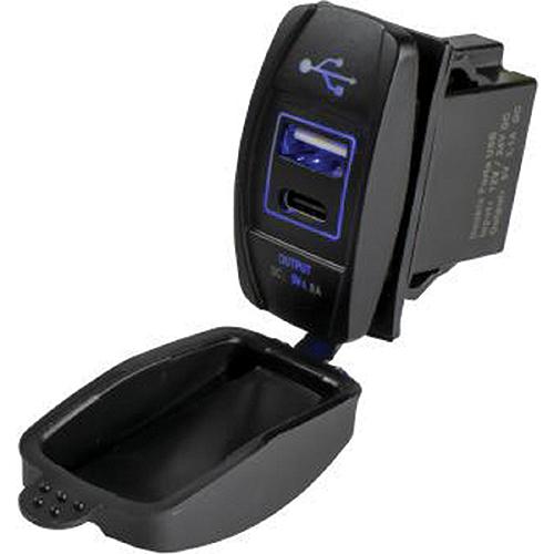This USB & USB-C Rocker Switch Style Power Socket charges two devices simultaneously. Fits into any 13/16" x 1-7/16" rocker switch hole. The total output 4.8A load is split 2.4A per side as needed. USB-C features Power Delivery (PD) for faster and more flexible charging. Enough power to charge phones, pads, and tablets quickly and efficiently. Protective dust cap extends the life of the charger. Constructed of injection molded nylon. Output DC 5V/4.8A. Input 8-32VDC. Blue LED display. USB-C Watts: 60W@24V. USB Watts: 36W@12V. IP65 rating. CE and RoHS compliant.