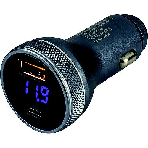 USB 3.0 & USB-C Power Plug with Volt Meter charges two devices simultaneously while the LED screen displays voltage status. Can be used on a boat, car, or RV. Total output 6A load is split 3A per side as needed. USB 3.0 features Quick Charging (QC) for supported devices, giving enough power to charge phones, pads, and tablets quickly and efficiently. USB-C features Power Delivery (PD) for faster and more flexible charging. This portable version fits all Sea-Dog® Power Sockets and any standard 12V receptacle. Constructed of aluminum and injection molded nylon. Output DC: 5V/6A. Input: 12-24 VDC. Blue LED display. FCC, CE, RoHS compliant.