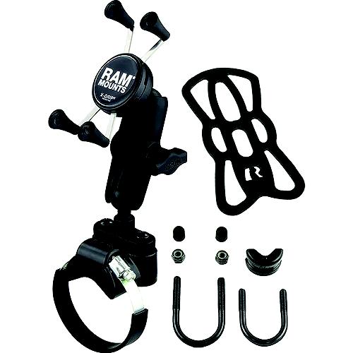 Consists of a steel strap base, stainless steel u-bolt base, double socket arm and universal spring loaded X-Grip® cradle for cell phones. The X-Grip® sports great holding power without hiding your phone behind foam pads and plastic. Includes a device tether recommended for outdoor applications. Phone mount for ATV/UTVs includes standard size phone holder, rail and bar base with strap clamp and U-bolt componentsRAM® strap mount will accommodate most common roll bar sizes on UTV and handlebar sizes on ATVsMade of powder-coated, marine-grade aluminum for durability and reliability in the most demanding environmentsBacked by a lifetime warrantyCompatible with: Width Range: 1.875" - 3.25" Depth Range: .875" max