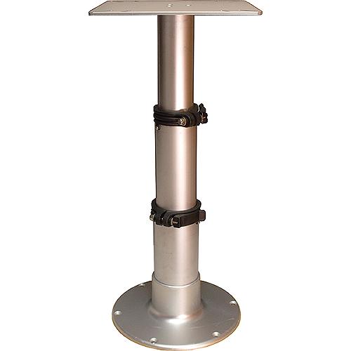 12-1/2" square table mount. 12" diameter base with 11" hole pattern for added stability. Nylon clamping bushings with stainless steel hardware. Air-Powered height adjustment, simply release to raise or push down and lock in place. No pumps or power required. Great for boat, RV, deck, and patio.