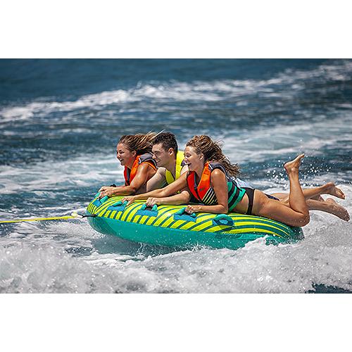 3-person TRIO Xtra towable tube is based on the world's most popular tube design. These are low-profile designs, which make them easy to board. The soft neoprene body pads offer a comfortable non-chafing ride. Patent-Pending Bladder ControlPatent-Pending Love Handles2 Neoprene Deck Pads840D Heavy-Duty, Double-Stitched Nylon CoverHeavy-Duty PVC BladderWeight Capacity: 510lbs(8) Tow Handles80.5" Diameter
