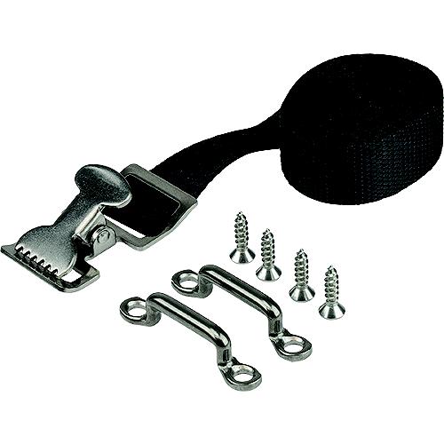 For use in securing a portable gas tank. Gas Tank Strap kit includes: 1" x 6' nylon webbing strap with 304 stainless steel buckle, two 304 stainless steel footman's loops, and four #10 FH fasteners.
