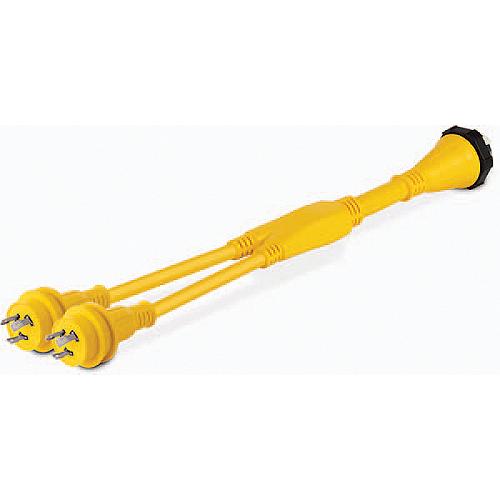 Y' adapters allows the user to connect (2) 30A dockside receptacles to a single 50A/125V boat inlet. Sierra 'Y' adapters are easy to use and perfect for the harsh marine environments. Yellow PVC cord jacket with maximum UV inhibitorsJacket Rating: STW 600VAC @ 60°CHigh quality, corrosion resistant nickel-plated brass contactsNylon plug body for high resistance to carbon trackingETL Listed