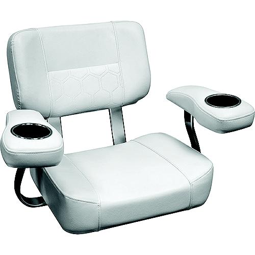 Oversized padded armrests w/ dual stainless drink holders Heavy duty, anodized arm & back support bracketsCompression foam paddingHeavy-duty 28 oz marine grade vinylUV treated and mildew resistantIncludes universal mounting plateSitting Depth: 16"Sitting Width: 16"