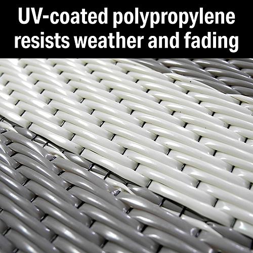 FulTyme RV Outdoor Patio Mat in Grey/Light Tan and is 8' x 16'. Tight weaving and reinforced stitching for long lasting durability. UV coated polypropylene material for weather and fade resistance. Lightweight for easy handling. Reversible-like getting two mats in one. Heavy duty piping on two sides with reinforced corner and stake loops (stakes sold separately). Tight weaving and reinforced stitching for long lasting durabilityUV coated polypropylene material for weather and fade resistanceLightweight for easy handlingReversible-like getting two mats in oneHeavy duty piping on two sides with reinforced corner and stake loops (stakes sold separately)Mats fold easily for storage