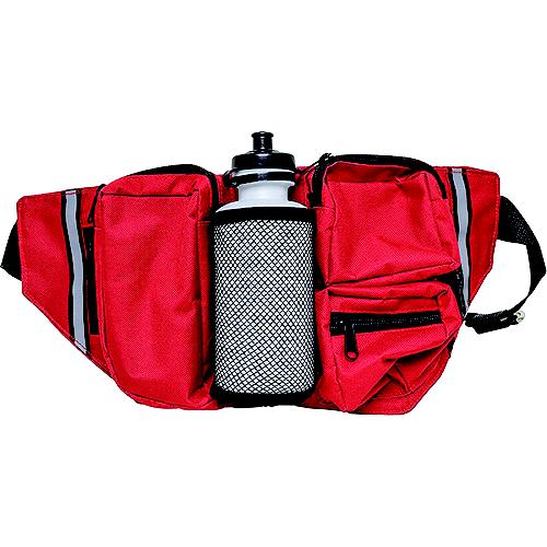 Deluxe waterproof waist pack with 5 zippered pockets Reflective strips for safetyAdjustable waist strapIncludes 18 oz. water bottle in its own holder and 4' leash that clips onto waist pack
