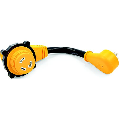 For hooking your marine-style 30-Amp or 50-Amp RV power inlet to a standard power source. 90° connector reduces strain on the cord and allows easier connection in tight places. Threaded locking ring helps to create a weatherproof connection. 15 Amp standard male plug and 30 Amp locking female receptacleThreaded locking ring creates a weather-resistant connection90° outlet connection reduces strain on the RV/cord and allows easier connection in tight placesDurable adapter with long-lasting cordCable with 10AWG 3-wire, NEMA L5-30R or NEMA SS2-50R and NEMA 5-15P connections (max: 125 Volts and 1875 Watts)