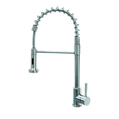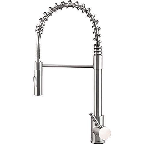 This coil-spring kitchen sink faucet features a flexible, pull-down style, as well as spray and stream functions that let you effectively rinse and clean. High-quality materials give this faucet a high-end look and feel, and the single-handle design offers ease of use. 304 Grade stainless steel constructionPull-down faucet head with toggleToggle for stream or spray optionsEasy DIY installation