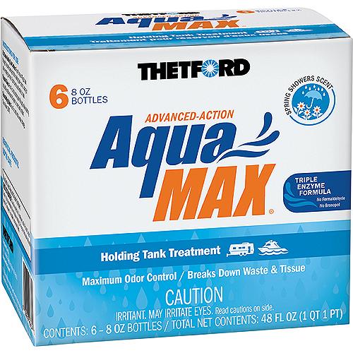 AquaMax®, the no Formaldehyde, no Bronopol holding tank treatment.AquaMax® Holding Tank Treatment's advanced enzyme powered formulas neutralize odors and accelerate waste digestion to prevent clumping, clogging and tank residue, all at the same time. Thetford's beneficial probiotic treatments are Bronopol Free and Formaldehyde Free to provide campground friendly and California compliant solutions. Formaldehyde FreeBronopol FreeNeutralizes odorBreaks down waste to prevent clumping, clogging and tank residueEnzymes optimized for MAX performanceBeneficial probiotics; good bacteriaSeptic system safeCampground and Marina FriendlyCompliant with all current regulationsConvenient family of options; liquids, dry granules and Toss-Ins® One dose treats a 40-gallon holding tank